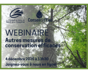 Le 4 décembre 2025 s’est tenu, de concert avec le Conseil de l’eau gaspésie sud (CEGS), un webinaire d’information sur les AMCE, Autres mesures de conservation efficaces. La présentation, créée par Nature Québec, avait pour but de mieux faire connaître cet outil de conservation reconnu à l’international et complémentaire au réseau d’aires protégées. Ces aires de protection, gérées par divers acteurs, permettront d’atteindre les objectifs de conservation établis au Québec, comme le 30% de territoire protégé d’içi 2030.