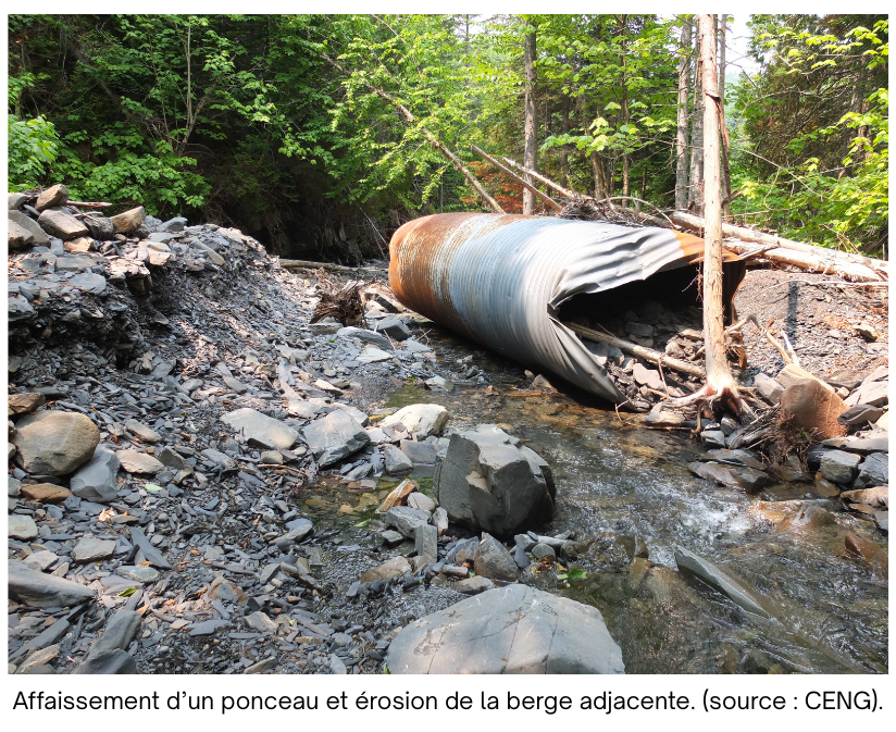 L’abondance et la désuétude des ponceaux dans le réseau de voirie forestière pose un enjeu au niveau de la libre circulation du poisson. En effet, ces ponceaux, en se détériorant, risquent de se déformer, se fissurer ou même s’effondrer. Ils peuvent également provoquer de l’érosion à la sortie du ponceau, créant une chute infranchissable pour le poisson, en plus de générer des apports de sédiments en aval. Ces enjeux contribuent à la fragmentation de l’habitat du poisson, rendant inaccessibles certains tronçons du cours d’eau situés en amont. Cela est particulièrement préoccupant pour les salmonidés, pour lesquels les effectifs sont en baisse depuis quelques années.