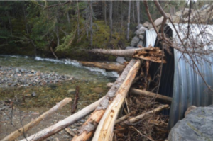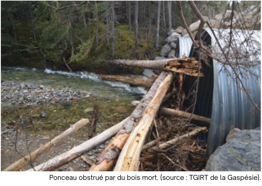 Par ailleurs, face à leur abondance et à leur l’abandon, l’obstruction des ponceaux peut également engendrer une entrave à la libre circulation du poisson. Le bois mort et tout autre matière ligneuse, bien que naturellement présents dans les cours d’eau, peuvent s’accumuler dans le ponceau et à son entrée. Un entretien régulier permet d’enlever ces obstructions. Toutefois, dans le contexte où cet entretien ne serait pas effectué, cette situation devient problématique, d’autant plus si elle est présente à plusieurs endroits. Les ponceaux se bouchent de bois mort et d’autres matières. L’eau peut parfois dévier de sa trajectoire en contournant l’infrastructure, entraînant de l’érosion et des dommages structurels. Le poisson voit son habitat fragmenté et détérioré, alors que le ponceau obstrué empêche la remontée du cours d’eau et peut modifier l’habitat aquatique.