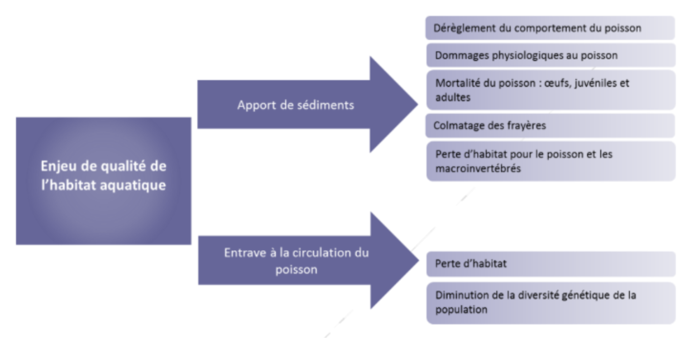 Notamment, la sédimentation peut entraîner le colmatage des frayères. Les sédiments fins viennent obstruer les interstices présents dans le substrat grossier de la frayère. Le colmatage des frayères peut causer de la mortalité au niveau des œufs de poisson — insuffisamment oxygénés — se trouvant dans le substrat, ainsi qu’un dérèglement comportemental lors de la période de fraie. Selon le Guide de l’aménagement de ponts et ponceaux dans le milieu forestier², lorsque le gravier de la frayère comporte entre 10 % et 20 % de sédiments, le taux d’émergence des alevins – stade larvaire du poisson – diminue de manière considérable. La situation est considérée grave lorsque ce taux augmente au-dessus de 20 % et la frayère est considérée inviable lorsque les sédiments fins composent 50 % du substrat. Les frayères endommagées peuvent rester inutilisables pendant plusieurs années².