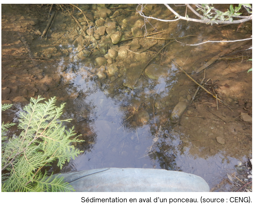 Comme mentionné précédemment, la voirie forestière est liée à un fort potentiel d’érosion et de sédimentation, en particulier au niveau des traverses de cours d’eau mal installées ou mal entretenues. Par ailleurs, le lessivage des chemins forestiers constitue également une cause d’apport en sédiments dans les cours d’eau. La construction de la voirie et des infrastructures associées nécessite l’ajout de matériel minéral. C’est ce matériel qui est susceptible de s’éroder et de s’écouler vers les cours d’eau, lorsque les structures de drainage sont défaillantes ou absentes. Cet apport excessif en sédiments entraîne le dépôt de particules fines (sable ou limon) sur le lit du cours d’eau ainsi qu’une augmentation de la turbidité de l’eau. Ce processus entraîne des changements, souvent nocifs, au niveau de la qualité de l’habitat ainsi que de la physiologie et du comportement du poisson.
