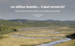 Les milieux humides, longtemps mal perçus, sont aujourd’hui reconnus pour leurs nombreux rôles écologiques. Ils régulent les crues, filtrent les polluants et séquestrent le carbone, contribuant ainsi à la lutte contre les changements climatiques. On distingue plusieurs types : étangs, marais, marécages et tourbières. Bien que peu présents au nord de la Gaspésie, ils y jouent un rôle essentiel pour la biodiversité et la qualité de l’eau.